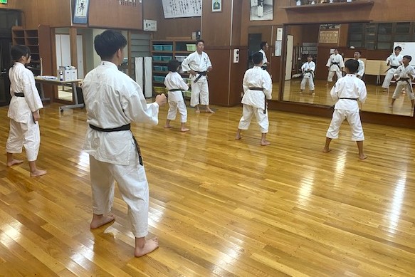 鏡を見て自分の構えや突き蹴りをチェックします。